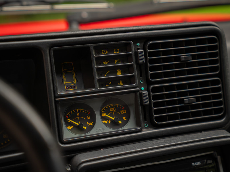 Dit mag dan een racer pur sang zijn, Lancia wilde duidelijk niets weten van een sobere uitrusting. Binnenin onderscheidt de opper-Delta zich van zijn ‘mindere’ soortgenoten aan de hand van uitstekend zittend sportstoelen, geperforeerde aluminium sportpedalen en prachtige Alcantara grijze stoel-, portier- én hemelbekleding. Niet alleen de afwerking is de moeite waard, ook de algehele conditie laat niets te wensen over. De HF Integrale Evoluzione mag dan nauw aan de autosport verwant zijn, in deze cockpit is duidelijk niet heel hard gewerkt. En dat bedoelen we op een positieve manier.