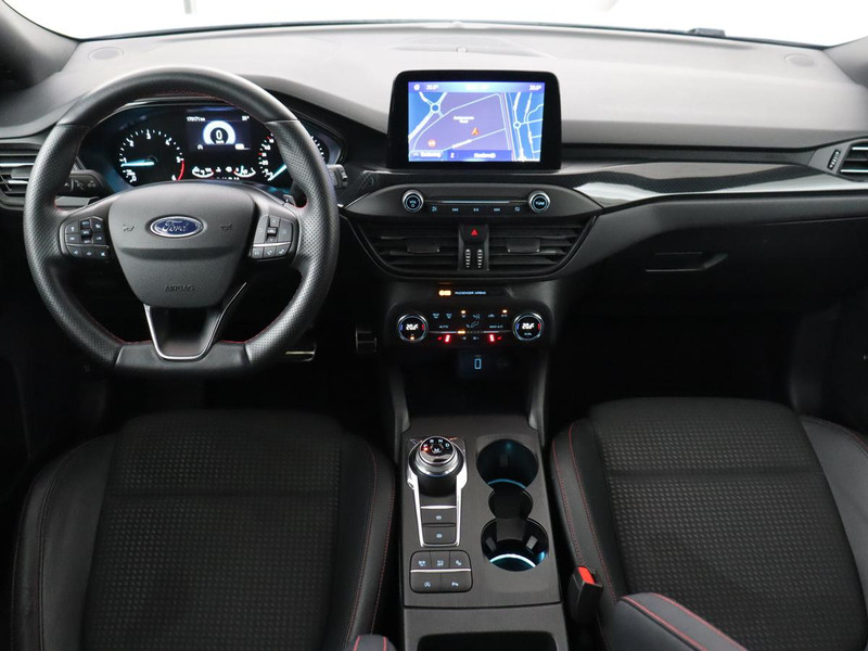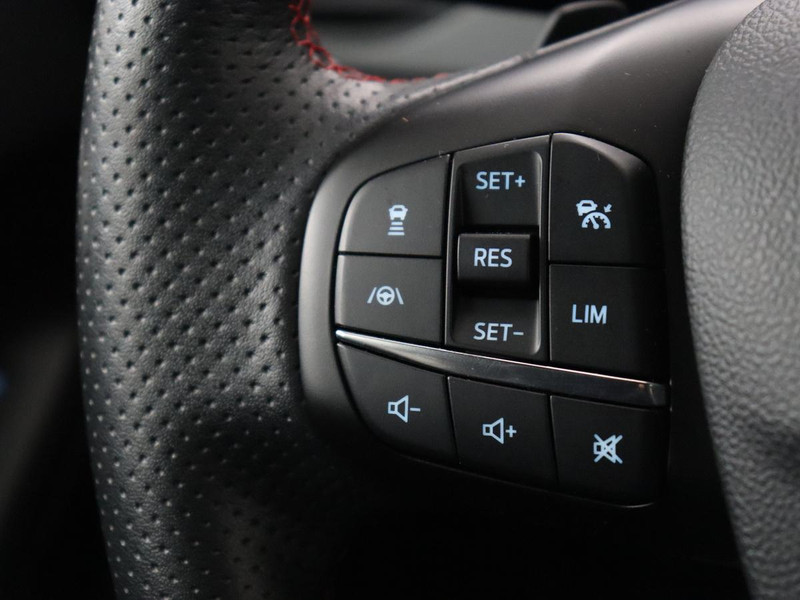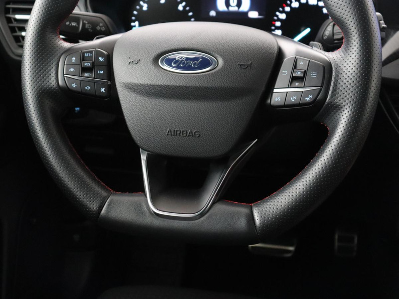Ook achter de auto geen verrassingen bij het inparkeren. Daarvoor zorgt de achteruitrijcamera. Adaptive cruise control is veilig en comfortabel. De snelheidsregelaar houdt automatisch afstand tot het voertuig dat voor u rijdt. Veilig en comfortabel rijden wordt nog eens versterkt door Connected Services, zodat u diverse vitale functies van de auto altijd kunt checken in de app. Onderweg kunt u veilig genieten van het audiosysteem met DAB-radio en het full map navigatiesysteem. Want in deze Ford bedient u ze vanaf het stuurwiel of met uw stem. Natuurlijk is een complete auto als deze ook voorzien van sensoren die de omgeving in de gaten houden. Deze Ford heeft niet alleen een automatisch inschakelbare verlichting aan boord, maar ook een regensensor. Deze auto is voorzien van sportstuurwiel, keyless entry, airconditioning, automatisch dimmende binnenspiegel, boordcomputer en lederen versnellingspook.