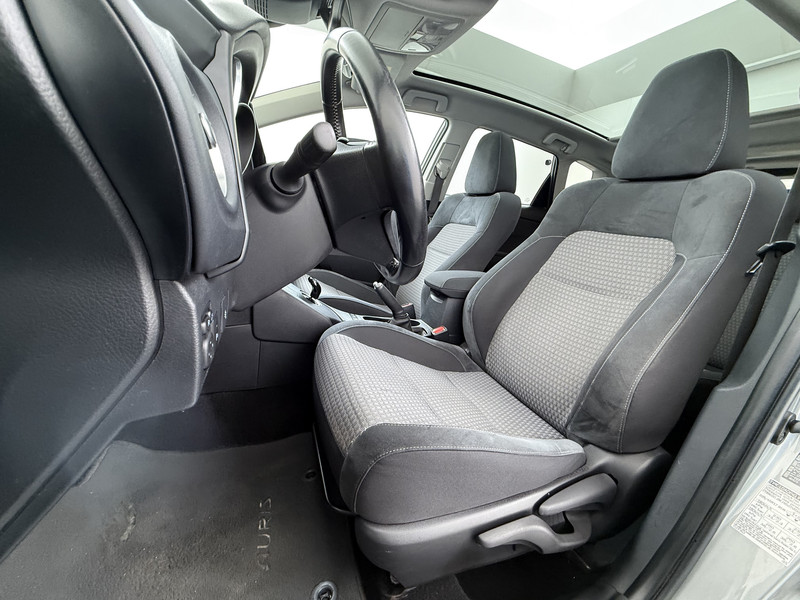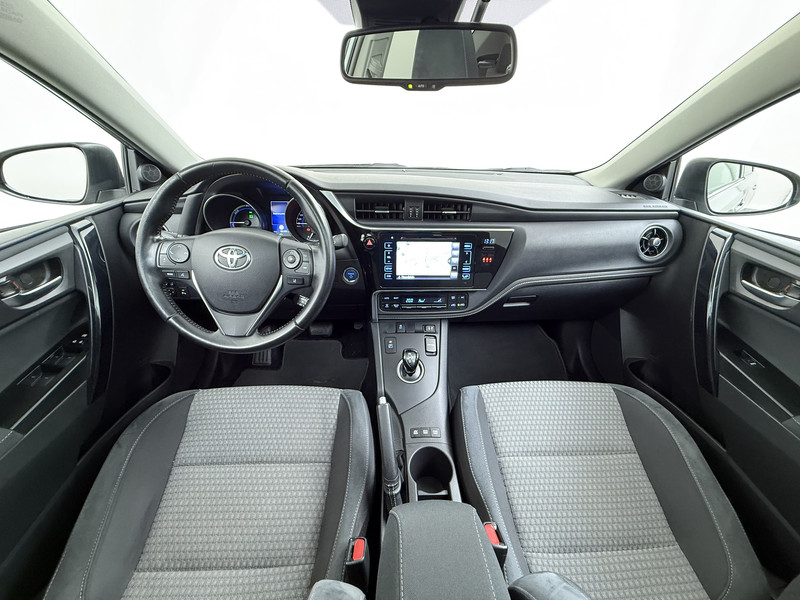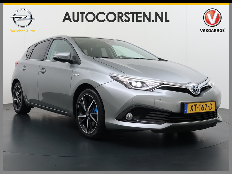 De vormgeving van deze Toyota Auris is stijlvol maar ingetogen en dat maakt meteen duidelijk dat u van deze auto pure kwaliteit mag verwachten. Het beste van twee werelden komt samen in de hybride motor. Daarmee wordt deze Toyota Auris aangedreven door zowel brandstof als door de elektrische accu, die al rijdend of remmend wordt bijgeladen. De sportstoelen houden u en uw passagier stevig vast tijdens een snelle rit, maar bieden ook altijd comfortabele ondersteuning. Vergezichten krijgen een extra dimensie door het glazen panoramadak. Tot de uitrusting behoren ook 17 inch lichtmetalen velgen, LED koplampen, donker getint glas achter, in delen neerklapbare achterbank, LED-achterlichten en verstelbare lendensteunen.