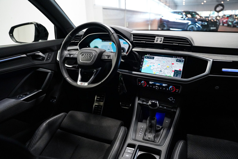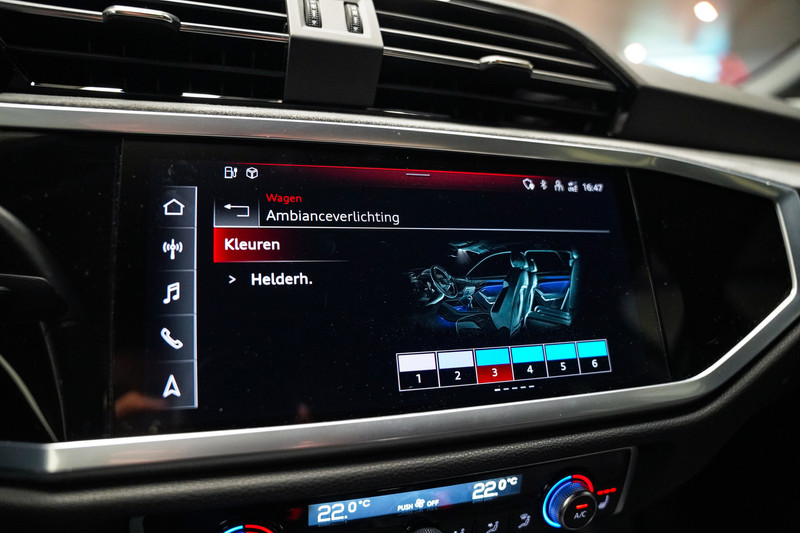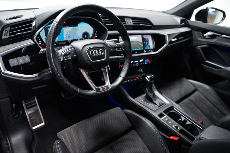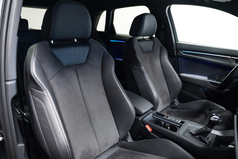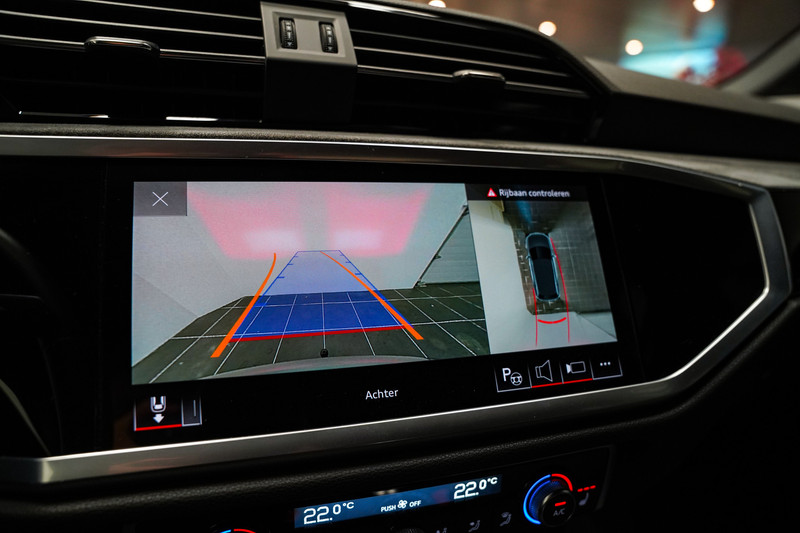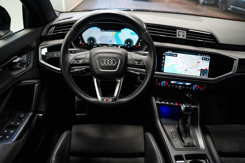 Een bloedmooie Audi Q3 45e S-Line afkomstig van de Audi dealer met o.a. matrix led, 20 inch, zwart optiek, leder/alcantara sportstoelen, een zwenkbare trekhaak, adaptive cruise control, een 360* rondomzicht camera, sfeerverlichting en een elektrische klep!
