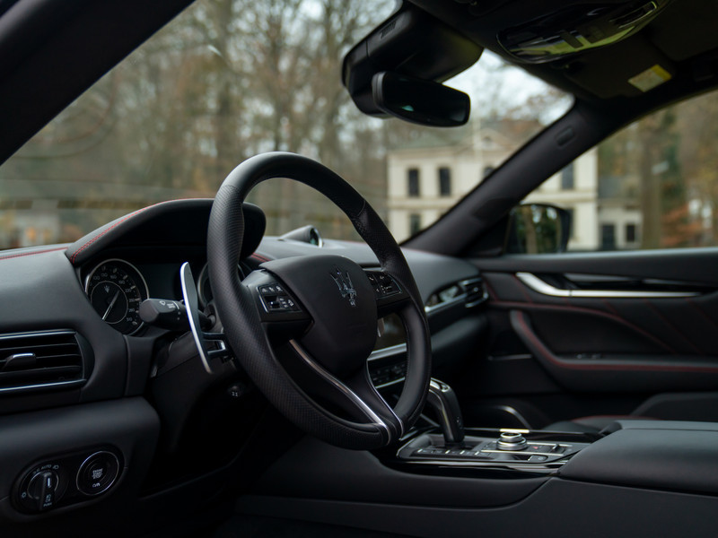 Fraaier dan een familiewagen. Sneller dan een SUV. Ruimer dan een sportauto. De Maserati Levante S is onmogelijk in een hokje te plaatsen. Hij heeft de looks van een topmodel, de performance van een topsporter en de veelzijdigheid van een topklasse SUV. Deze knappe faceliftversie, afkomstig van de 1e eigenaar, is extra opwindend op alle mogelijke vlakken. Te beginnen met de techniek: 430 pk aan dubbel geblazen 3,0 liter V6-power, gekoppeld aan beide assen, staat garant voor een explosieve acceleratie (0-100 km/h binnen 5,2 tellen) en vrachten grip. De Levante S AWD jaagt door zijn 8 automatische versnellingen tot een indrukwekkende 264 km/h in beeld komt. Andere zaken die lekker op het netvlies liggen hebben te maken met de aankleding en uitrusting. Zo staat de uiterst elegant gekleurde Grigio Maratea carrosserie op 21 inch grote velgen in contrasterend zwart, met daarachter vuurrode remklauwen om het accent maximaal op de (stop)krachten van de Maserati te leggen. Binnenin komt het Rosso terug in de vorm van contraststiksels in de Nero lederen delen; en dat zijn er nogal wat. Groen zijn de vinkjes achter een hele rits fabrieksopties, waaronder: stoel- en stuurwielverwarming, een 360 graden camera, Lane Keeping Assist, Harmon Kardon audio en draadloze Apple CarPlay om uw favoriete tracks moeiteloos door de hoogwaardige speakers te laten klinken. Wie de oren wil laten strelen kan uiteraard ook een beroep doen op de bloedstollende sound van 430 paarden. Wie had ooit gedacht dat we dat over een SUV zouden kunnen zeggen?