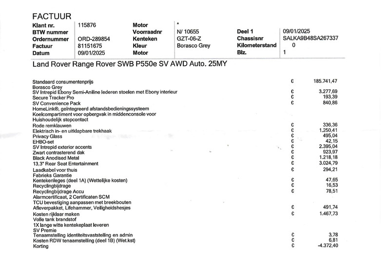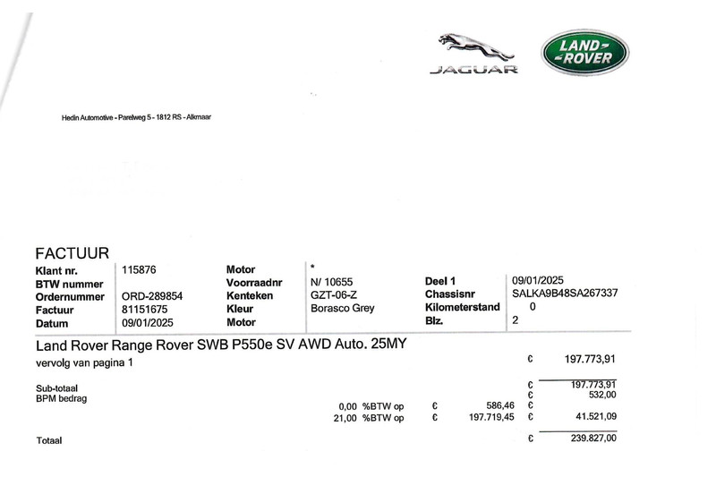 Origineel Nederlandse en 1e eigenaar Range Rover P550e PHEV Plug-in hybrid in de meest complete SV uitvoering in de kleur Borasco Grey met zwart dak en 22 inch gloss black velgen style 1073 met Michelin AllSeason banden, Slechts 9.120 km gereden, Absolute nieuwstaat, Zie onze website Hazet.nl voor 181 detailfoto's van deze auto, Originele aankoopfactuur aanwezig van 239.827 euro na korting (zie scan tussen de foto's), bruto nieuwprijs 245.117 euro. Bovenop de al overcomplete SV uitvoering staan de volgende meerprijs opties op de factuur: SV Intrepid exterior accents, SV Intrepid Ebony Semi-Aniline lederen stoelen met Ebony interieur, SV Convenience pack, HomeLink afstandsbediening, Rear Seat Entertainment met 13,3 inch schermen en draadloze headsets (nooit gebruikt nog in plastic), Elektrisch in- en uitklapbare trekhaak, Privacy glass, Rode Brembo remklauwen, Secure Tracker Pro, Black Ceramic Matt bedieningselementen, Zachtgenerfd leder stuurwiel, SV Veneer-Black Anodised Satin & Artwork, Koelcompartiment voor opbergvak in middenconsole voor, Houdhoudelijk stopcontact, Alarm klasse 3 met certificaat, Laadkabel voor thuis. 5 jaar fabrieksgarantie tot en met 150.0000 km. Buiten de meerprijs opties de meest opvallende zaken: SV Bespoke Full Extended Leather Upgrade, Volledig lederen hemelbekleding, Lederen hoedenplank elekrisch inklapbaar en uitklapbaar, Leder dashboard, Digitale cockpit met Apple Carplay en Navigatie weergave, 360 3D Surround Camera, Luchtvering, Panorama schuif/kanteldak, Elektrische stoelverstelling met geheugen voor en achterin, Buitenste 2 zitplaatsen neerklapbaar tot ligmodus, Elektrisch neerklapbare achterzittingen, DAB, Apple Carplay en Android Auto, Stuurwielverwarming, Stoelverwarming, Massagestoelen met verschillende massageprogramma's en Hot Stone modus, Neerklapbare module met Touch-screen tablet tussen de achterstoelen in, 5-persoons uitvoering, Meridian Signature High End Audio, Head-up display, Elektrische stuurverstelling, Sfeerverlichting met verschillende kleuren, Verlichte SV dorpellijsten, Gelaagd glas zijruiten extra isolerend, Adaptive cruise control met steerring assist, 13,1 touch-screen scherm, Twin-Speed tussenbak met hoge en lage gearing, Verwarmde voorruit en ruitensproeiers, Standkachel interieurvoorverwarming, All Wheel Steering vierwielbesturing, Bright Metal pedalen, Verkeersbordenherkenning, Draadloze telefoonlader, Camera binnenspiegel (kan ook op normale modus), Stoelventilatie / stoelkoeling voor en achter, Skiluik, Dynamische richtingaanwijzers, Zonneschermen achterin, Satin Chrome schakelpaddels, AWD vierwielaandrijving, Soft Door Close, Parkeersensoren voor en achter. 3.0 benzine 6-cilinder plug-in hybride met 550 PK met 8-traps automaat. Van 1 particuliere Nederlandse eigenaar geweest, daardoor een marge auto, geen verrekenbare BTW.