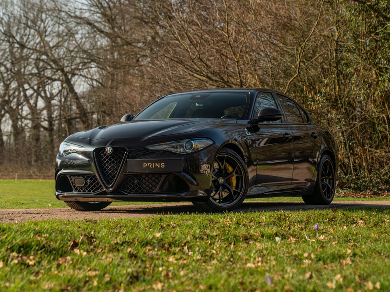Explosief. Heet als vuur. Compleet zwartgeblakerd en dan noemen ze de lak ook nog “Nero Vulcano”. Dat kan geen toeval zijn… Deze gruwelijk mooie Alfa Romeo Giulia Quadrifoglio van modeljaar 2021 slaat genadeloos hard toe als het gaat om pure pracht, power en prestaties. Wat dat betreft hadden ze de Giulia Q ook wel “Triplo P” kunnen noemen. Maar ja, dan was de verwijzing naar het iconische klavertje vier niet compleet geweest. Driedelig is tevens de zwarte uitdossing van de 510 pk sterke bi-turbo V6 – daarover verderop meer. Een Carbon in- en exterieur, Driver Assistance Pack 2, Apple CarPlay, camera en Akrapovič sportuitlaatsysteem maken van dit brute snelheidswonder een ongekend spektakelstuk op wielen. Wie durft?