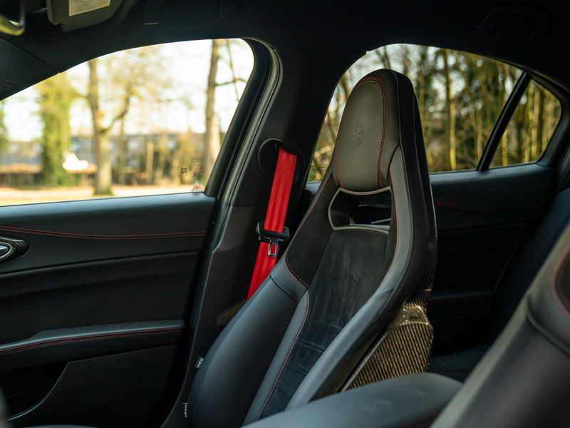 Toegegeven, de Rosso Competizione lak staat deze anabolen Alfa waanzinnig. Echter, zó is de Giulia Quadrifoglio op haar puurst: inktzwart van boven tot onder. Letterlijk. Diverse Carbon details – waaronder de frontlip, sideskirts, grille en kofferklepspoiler – gaan voor het oog op in de duistere, Nero Vulcano carrosserie van onze performance-gedreven Berlina. De mysterie is compleet dankzij de 19 inch spaak-wielen. Erachter pronken Giallo remklauwen die het race-DNA weerspiegelen van de Romeo onder de Giulia’s. Bredere spatborden, dikkere bumpers, extra koelsleuven en een enorme diffusor zijn typerend voor elke moderne Q-versie. Zo ook deze. De 2 dubbele eindstukken van het Akrapovič sportuitlaatsysteem onderstrepen het heftige karakter van de Alfa. Het is dat er 4 portieren in de sportsedan zitten, anders zouden we toch zweren een supercar pur sang tegenover ons te hebben. En we verklappen alvast: de looks corresponderen met de prestaties…