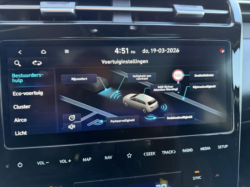 De geavanceerde technologie in deze Hyundai is in staat om onderweg het verkeer om u heen te monitoren en er op te reageren. Zo hebt u als het ware een automatische co-piloot aan boord. Tijdens de rit hebt u altijd een bijrijder, want de verkeersbord-detectie leest de borden langs de weg en projecteert ze voor u op het instrumentarium. Onbedoeld buiten de rijstrook raken wordt voorkomen door het Lane-keeping systeem. Forward collision warning waarschuwt bij een dreigende aanrijding met een voorligger. Met voorzieningen als hill hold functie, vermoeidheidsherkenning, autonoom remsysteem en bandenspanningcontrolesysteem, bent u altijd veilig onderweg.