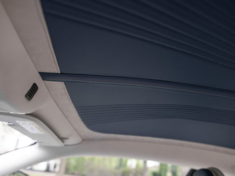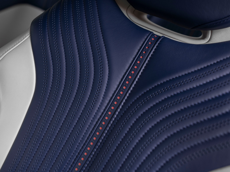 En dan moet de grootste verrassing nog komen: u dacht dat wit leder gewaagd was? Is het ook. Maar de Britten voegden tevens legio Aurora Blue delen aan het Yvory lederen binnenwerk toe. Gewoon, omdat het kan. En belangrijker: omdat het de 2+2 GT waanzinnig goed staat! De verdeling is redelijk 50:50 met het stuurwiel, bovenzijde dashboard, midden-/tunnelconsole, middenarmsteun, hoofdsteunen, binnenste delen van de sportstoelen + deurpanelen in Aurora Blue. De rest kleurt Ivory, inclusief alle stijlen. Maar let op: de hemelbekleding is op zijn beurt weer hartstikke blauw. Hier is duidelijk over nagedacht! En wel door iemand met smaak. Stiksels zijn uitgevoerd in bijpassende accenten om een al te druk contrast tegen te gaan. Daarvoor in de plaats bevatten de geperforeerde banen over de stoelen, portieren en dakhemel rode stippen. En dus is de verbinding met de remklauwen c.q. een bloedstollende performance gelegd.