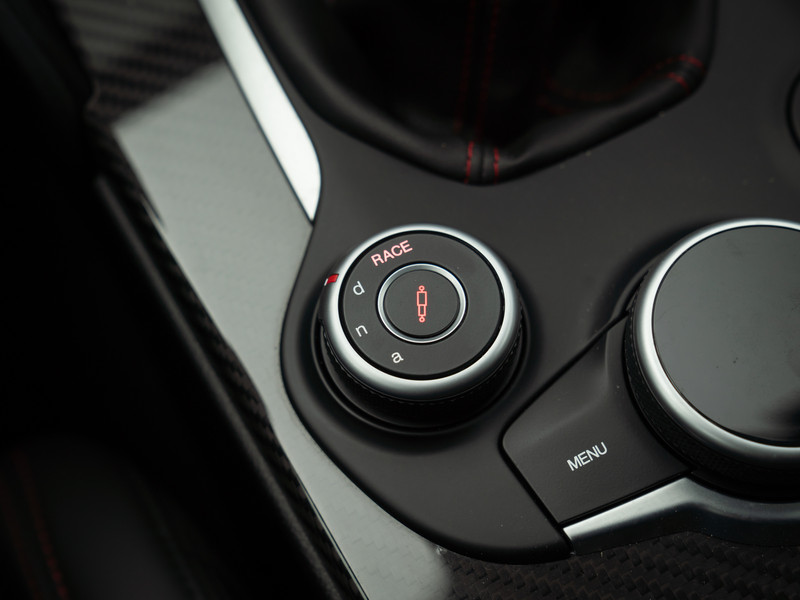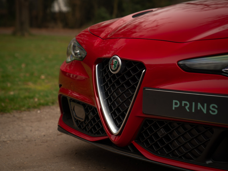 Een Alfa naar ons hart: deze Giulia Q is er één voor de échte puristen. Voor wie karakter boven gemak verkiest. En de linkervoet net zo snel kan bewegen als de rechter. U leest het goed: de Rosso Alfa uitgevoerde Giulia Quadrifoglio op uw scherm beschikt over een manuele transmissie! De koppeling naar rijbeleving die intenser is dan intens, is daarmee al gauw gemaakt. Daarbij komt dat de rest van de configuratie even comfortabel als compromisloos is: Harman Kardon audio versus lederen-alcantara sportstoelen. Navigatie met groot scherm + achteruitrijcamera versus héél veel carbon in- en exterieurdetails. En zo kunnen we nog wel even doorgaan. De Alfa Romeo Giulia Q staat op 19 inch Quadrifoglio velgen en heeft de frontlipspoiler, sideskirts én achterspoiler carbon uitgevoerd. Binnenin hebben het stuurwiel, dashboard en de middenconsole een hightech koolstofvezel finish. Rosso contraststiksels in de Nero bekleding symboliseren het bloed dat op volle snelheid door uw aderen giert. Aan de Rosso remklauwen de eervolle taak om de 510 pk sterke 2,9 liter bi-turbo-V6 op tijd tot stoppen te dwingen na een felle 0-100 km/h sprint binnen 3,9 seconden. En anders? Ander zit er niets anders op dan via de handmatige 6-bak door te trekken tot een magische topsnelheid van 307 km/h. Slechts twee eigenaren ging u voor. Als u net zo’n liefhebber bent van pure Italiaanse schoonheid – tot en met de techniek – als hij, dan voorspellen we een bloedstollende proefrit op zéér korte termijn…