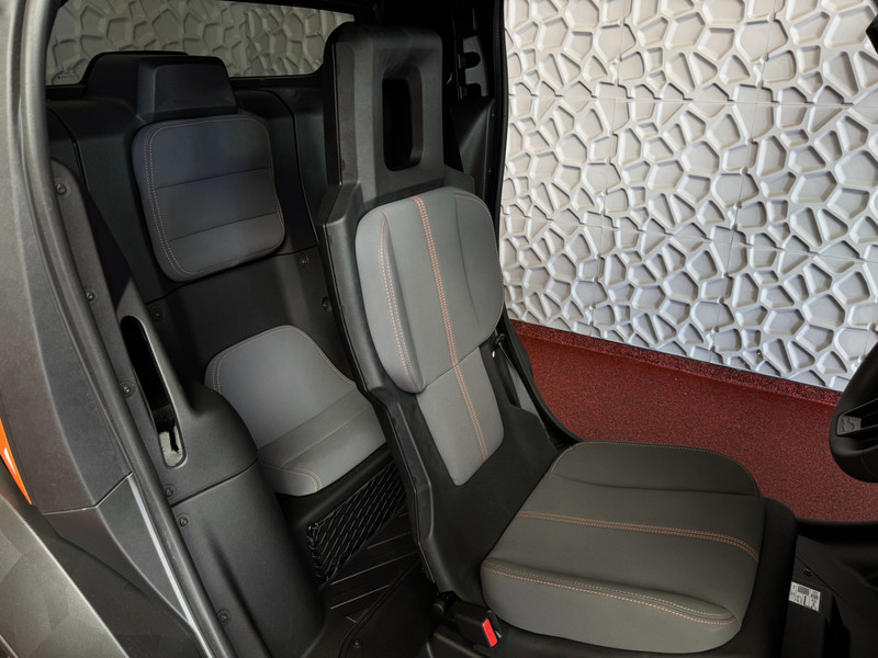 De Mobilize Duo is uitgerust met een premiumstoel. Deze stoel is ontworpen voor comfort en duurzaamheid, met grijze TEP-bekleding en oranje stiksels.