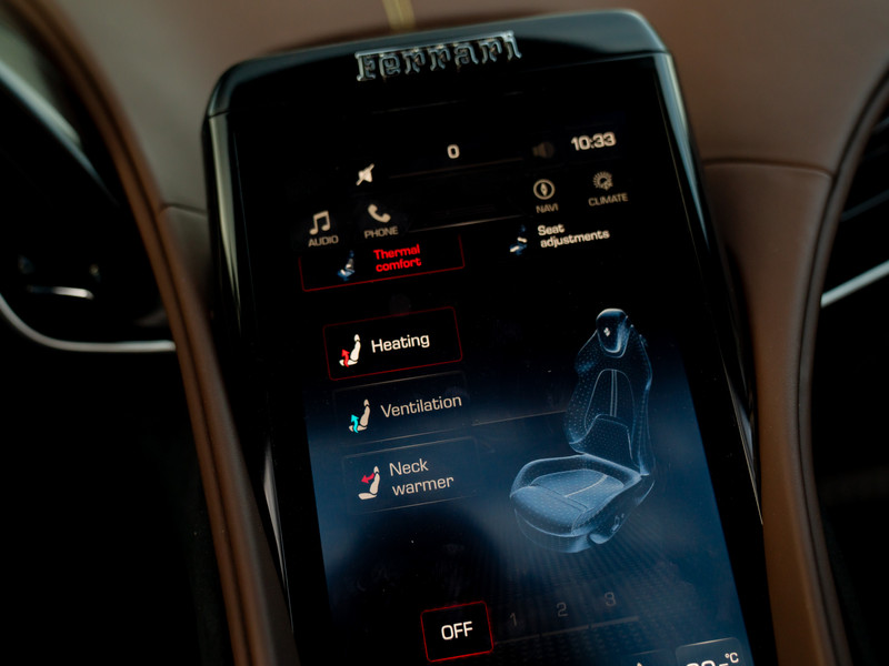 De symmetrie aan boord van de Roma Spider zorgt voor rust. De hoogwaardige Cioccolato lederen afwerking ademt kwaliteit, tot en met de vloertapijten aan toe. En de technologisch geavanceerde uitrusting? Die doet niet klinisch, maar racy aan. Zowel de carbon schakelflippers + stuurwiel met LED’s, als de Passenger Display staat immers in het verlengde van pure performance. Extra aandacht en applaus verdienen oogstrelende details zoals de mix met Nero alcantara delen en Giallo stikselswerk – van vloer tot dashboard en alles wat daartussenin zit. Ja, het geel maakt een connectie met de remklauwen. Echter, het is vooral de combinatie met de bruine en zwart bekleding die hoge ogen gooit. Let daarnaast op het chique ruitjesmotief in de stoelen. Deze Ferrari Roma Spider is het toppunt van verfijning en raffinement!