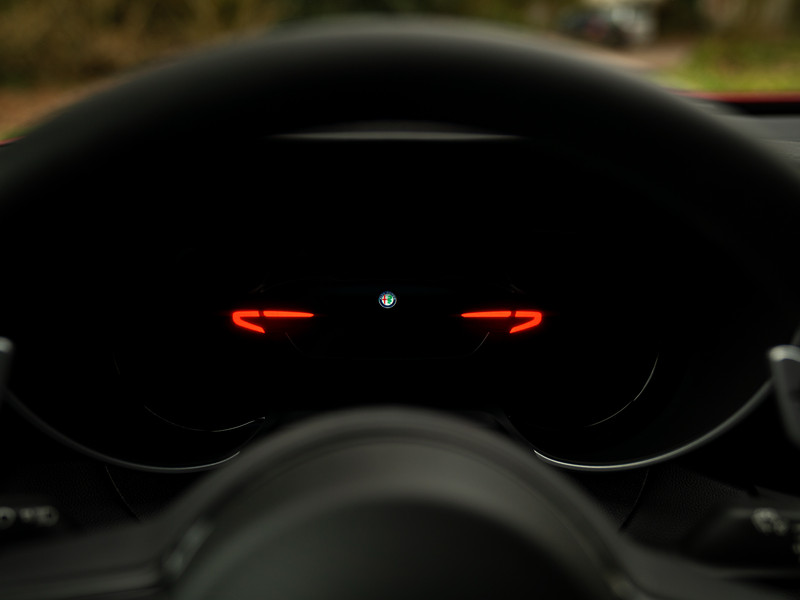 De echte kenner zal het laatste modeljaar van de Giulia Q met zijn of haar ogen dicht herkennen. Toch kunnen we het niet laten om kort de highlights te doorlopen. Met de nadruk op ‘lights’, want de herziende indeling van de koplampunits behoren toch wel tot de meest karakteristieke veranderingen. De 3 afzonderlijke LED-elementen per unit doen oude Alfa-tijden herleven, met de iconische 159 nog vers in ons geheugen. De donkere achtergrond van diezelfde koplampen zijn op hun beurt helemaal in lijn met de “smoked” achterlichten vanachter helder glas, alsmede de antracietkleurige Q-velgen, zwarte Scudetto grille, dito spiegelkappen en vele carbon exterieurdetails. Onder andere de frontlip, side skirts, kofferklepspoiler, en natuurlijk de afwerking rondom de Akrapovic uitlaateindstukken. Het contrast met de dieprode Rosso Etna lak is beeldschoon en weet iedereen te boeien. Wel óf geen autofanaat. Al denken we zeker te weten tot welke categorie de lezer behoort…