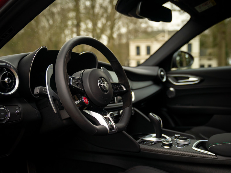 Sportsedans met een ziel worden niet ‘zomaar’ met uitsterven bedreigd. Nu de Alfa Romeo Giulia Quadrifoglio officieel uit productie is gehaald, zijn ze definitief ter ziele gegaan. Lang kunnen we daar niet treurig over zijn, want… Zie hier een gloednieuwe Alfa Giulia Q: de laatste der Mohikanen! Compleet met de meest recente specificatie en meest gewilde opties, waaronder: carbon sportstoelen van Sparco, een Akrapovič uitlaatsysteem, Harman Kardon audio, Technology Pack en heel veel meer. En hoe mooi is het dan dat we dit alles in een Rosso Etna vat hebben kunnen gieten? Leve de sportsedan met bezieling!
