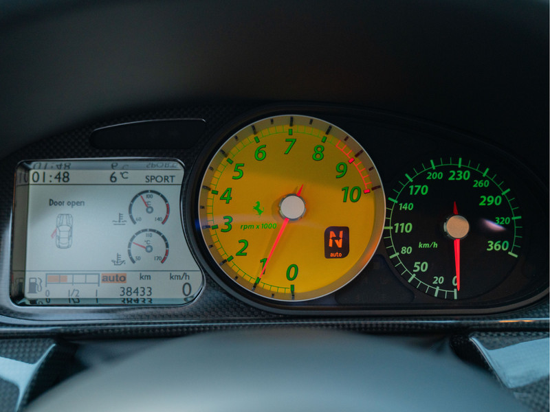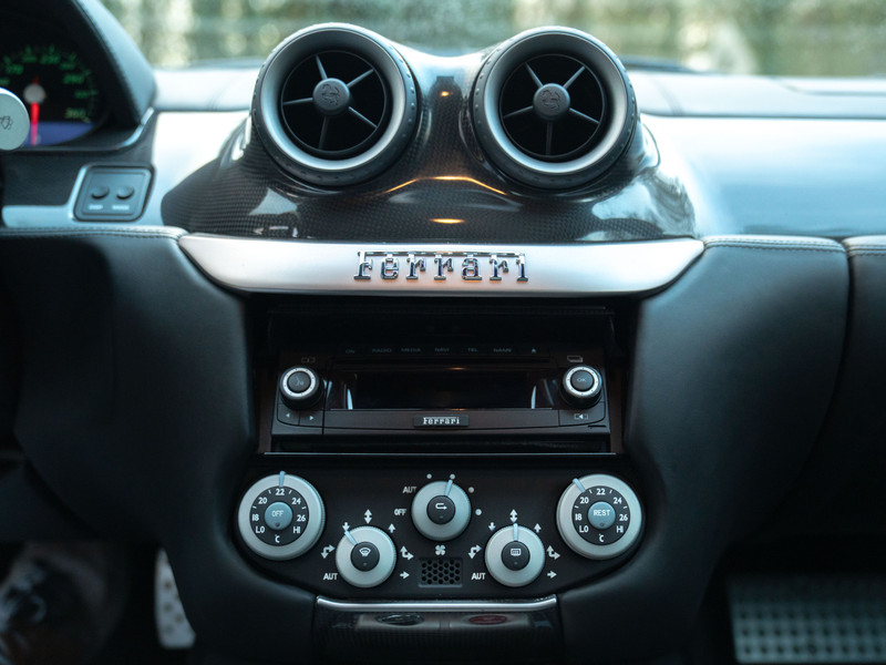 Onze 599 Fiorano moet het niet hebben van zijn uitbundige kleurgebruik. “Mooi”, horen we de purist denken. De Nero lederen bekleding mag dan geen verrassing zijn, het is wél doeltreffend. Net als de carbon interieurpakketten: onder andere het dashboard en de tunnelconsole zijn gemaakt van ultra lichtgewicht en peperduur koolstofvezel. De geperforeerde aluminium sportpedalen en carbon schaalstoelen nodigen extra uit om een bezoek aan het circuit te brengen. Fiorano bijvoorbeeld? De zetels houden de (let op: maximaal 2) inzittenden perfect in hun greep en zijn tevens elektrisch verstelbaar om de ideale zitpositie binnen no time gevonden te hebben. Bij de stoelverwarming zetten we echter vraagtekens. Hoe is het mogelijk om het níet warm te krijgen aan boord van de Gran Turismo Berlinetta, met al zijn pure performance?