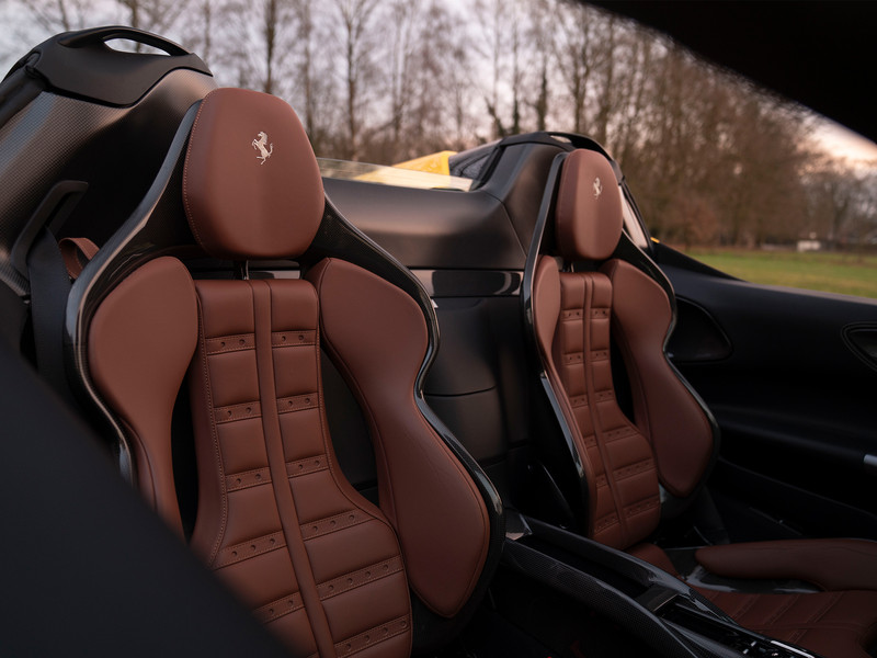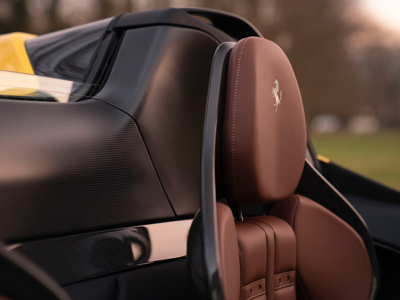 En wat is een zomers gekleurde hypercar zonder de zon te aanbidden? Wanneer het Nero DS dak wordt verwijderd, krijgen toeschouwers vrij zicht op de prachtige cockpit van de SF90 Spider. De Large uitgevoerde Carbon Racing Seats zijn in hoogte verstelbaar, bevatten legendarische Daytona patches en zijn afgewerkt met super smaakvol Terra Bruciata lederen bekleding. Hetzelfde donkerbruine leder komt terug op het stuurwiel en de portiergrepen. De onderzijde van het dashboard heeft op zijn beurt een Terra Bruciata alcantara finish, terwijl de Nero lederen bovenzijde + dito portieren voor een aangenaam contrast zorgen aan boord van de Ferrari. Grigio Chiaro Cavallino’s in de hoofdsteunen garanderen een stijlvolle landing van uw achterhoofd tijdens accelereren. Hoe minder gewicht, hoe korter de sprint: de Carbon Driver Zone (+ LED Shift Indicator), Carbon Centre Console en Carbon Dashboard Inserts hebben niet alleen een positieve invloed op de racy looks, maar ook op de prestaties. Klaar om de zilveren Dedication Plate aan uzelf op te dragen?