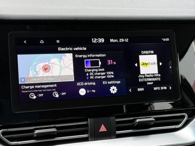 Zoals u mag verwachten van deze Kia e-Niro is hij uitgerust met een reeks aan actieve veiligheidssystemen. Mooi binnen de lijnen van de rijstrook blijven? Het Lane-keeping systeem helpt altijd een handje. Forward collision warning is een automatisch waarschuwingssysteem dat direct in werking treedt bij gevaar voor een kop-staartbotsing. Vermoeidheidsherkenning is een systeem dat met verschillende sensoren tekenen van vermoeidheid bij de chauffeur waarneemt. Deze krijgt tijdig een waarschuwing, wat ongelukken kan voorkomen. De veiligheid van deze auto wordt verder verhoogd door hill hold functie, autonoom remsysteem en bandenspanningcontrolesysteem.