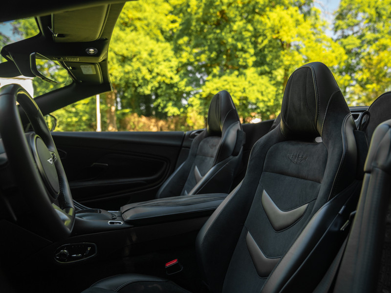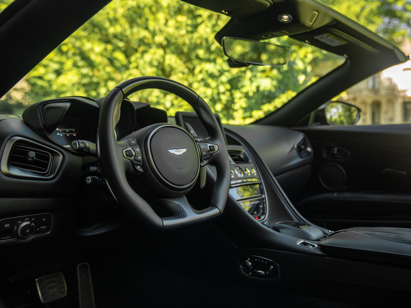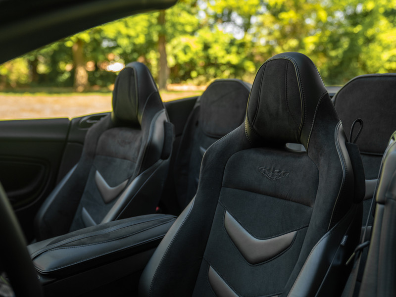 Treed binnen en meteen wordt duidelijk dat het koolstofvezel feestje op indrukwekkende wijze wordt voortgezet. Naast het carbon sportstuur en dito schakelpaddles, is ook een Carbon Fibre Twill trim op de optielijst aangevinkt. Deze delen hebben een zijdeglans afwerking, zodat de hardcore machine een luxueuze touch krijgt. Plaatsnemen doet u in elektrisch verstelbare én verwarmbare Sports Plus Seats, inclusief de befaamde Aston Martin Wings geïntegreerd in de hoofdsteunen. De meesterlijk zittende sportstoelen hebben een Obsidian Black lederen afwerking gecombineerd met Pure Black Alcantara delen, net als de rest van de cockpit. De fascinatie en mysterie zijn compleet dankzij de toevoeging van een Dark Chrome Jewelry Pack. Erg gevat, want een juweel op wielen is de Aston Martin DBS Superleggera Volante zeer zeker.
