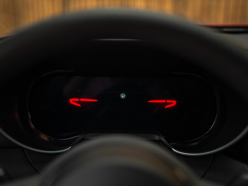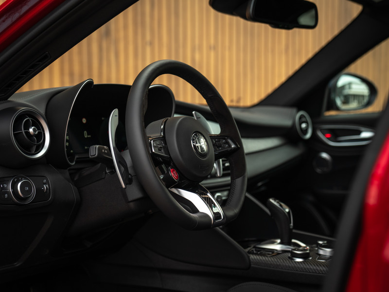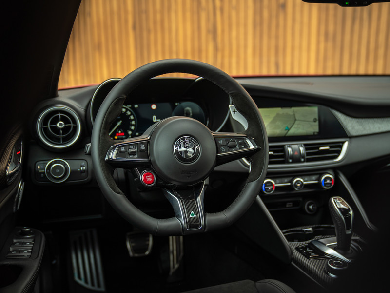 De echte kenner zal het laatste modeljaar van de Giulia Q met zijn of haar ogen dicht herkennen. Toch kunnen we het niet laten om kort de highlights te doorlopen. Met de nadruk op ‘lights’, want de herziende indeling van de koplampunits behoren toch wel tot de meest karakteristieke veranderingen. De 3 afzonderlijke LED-elementen per unit doen oude Alfa-tijden herleven, met de iconische 159 nog vers in ons geheugen. De donkere achtergrond van diezelfde koplampen zijn op hun beurt helemaal in lijn met de “smoked” achterlichten vanachter helder glas, alsmede de antracietkleurige Q-velgen, zwarte Scudetto grille, dito spiegelkappen en vele carbon exterieurdetails. Onder andere de frontlip, side skirts, kofferklepspoiler, en natuurlijk de afwerking rondom de Akrapovic uitlaateindstukken. Het contrast met de dieprode Rosso Etna lak is beeldschoon en weet iedereen te boeien. Wel óf geen autofanaat. Al denken we zeker te weten tot welke categorie de lezer behoort…