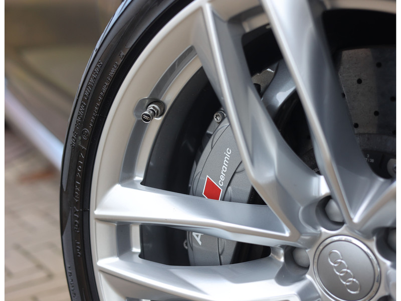 Binnenin gaat het feest verder, want wát een geweldige samenstelling is dit! De sportstoelen zijn bekleed met Moon Silver Valcona leder, voorzien van diamantstiksels en RS-logo’s. Ook hier is de auto tot in detail perfect samengesteld. Carbon interieurlijsten, een suède stuurwiel, Moon Silver leder om de automaatpook… Zelfs de Alcantara binnenhemel en de volledig lederen middentunnel zijn voorzien van contrasterende stiksels! 100 procent perfectie bestaat niet, maar deze RS6 komt extreem dicht in de buurt!