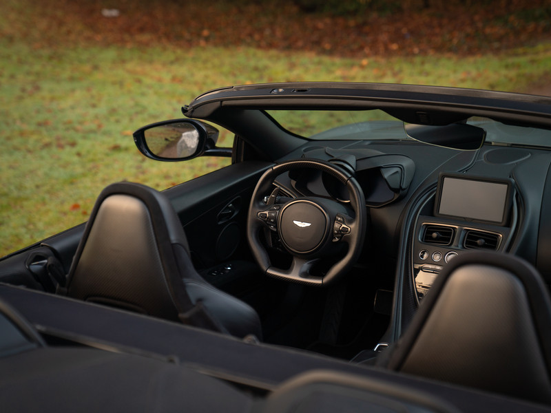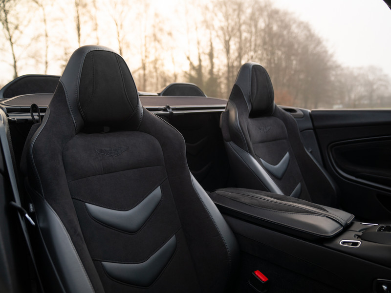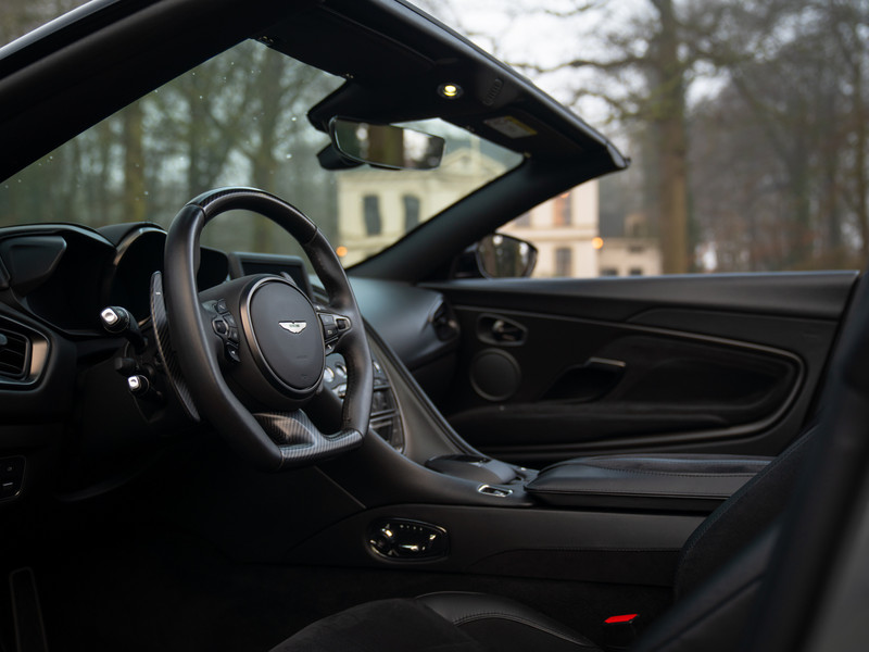 Treed binnen en meteen wordt duidelijk dat het koolstofvezel feestje op indrukwekkende wijze wordt voortgezet. Naast het carbon sportstuur en dito schakelpaddles, is ook een Carbon Fibre Twill trim op de optielijst aangevinkt. Deze delen hebben een zijdeglans afwerking, zodat de hardcore machine een luxueuze touch krijgt. Plaatsnemen doet u in elektrisch verstelbare én verwarmbare Sports Plus Seats, inclusief de befaamde Aston Martin Wings geïntegreerd in de hoofdsteunen. De meesterlijk zittende sportstoelen hebben een Obsidian Black lederen afwerking gecombineerd met Pure Black Alcantara delen, net als de rest van de cockpit. De fascinatie en mysterie zijn compleet dankzij de toevoeging van een Dark Chrome Jewelry Pack. Erg gevat, want een juweel op wielen is de Aston Martin DBS Superleggera Volante zeer zeker.