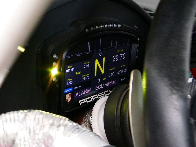 Weight-optimised magnesium subframe; Ergonomic driver-oriented centre console; Control switch trim with fluorescent lettering; Steering wheel with quick-release coupling, control panel and shift paddles; Adjustable steering column with steering angle sensor