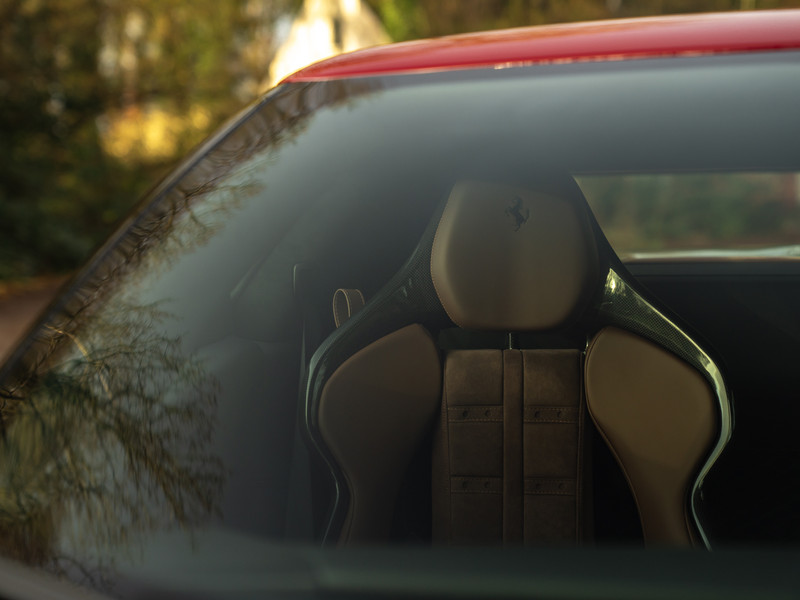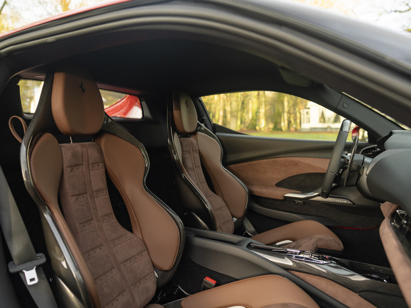 De specificatie van de cockpit is al net zo briljant: de interieurbekleding betreft een combinatie van Nero / Iroko leder én Alcantara! Klassieke Daytona patches op de Alcantara middendelen van de Carbon Racing Seats zorgen voor een verbluffend contrast en een ongekende aantrekkingskracht voor iedereen die Ferrari historie op waarde weet te schatten. Ongekend is ook hoe stijl, karakter en performance op geraffineerde wijze samensmelten aan boord van deze 296 GTB. Alleen de middentunnel al: het voorste deel is gemaakt van carbon en de zijkanten bevatten Nero ‘kussentjes’ die overgaan in Iroko Alcantara zijkanten, welke op hun beurt in één vloeiende beweging overgaan in een Nero lederen console afgewerkt met Iroko stiksels. Volgt u ons nog? Dezelfde combinatie komt één-op-één terug in het tweekleurige dashboard, waarvan de complete onderzijde een Iroko Alcantara finish + dito stiksels bevat. De complete dakhemel is vervolgens weer bekleed met Nero leder. Meer koolstofvezel is er ook: naast de Daytona Racing Seats en Carbon Centre Console zijn dashboard inserts én schakelflippers + stuurwiel carbon uitgevoerd. Die laatste beschikt tevens over een heuse LED Shift Indicator à la Formule 1. De ideale schakelmomenten gaan op die manier nooit meer aan u voorbij.