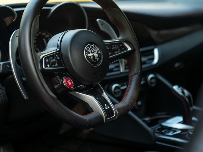 Toegegeven, de Rosso Competizione lak staat deze anabolen Alfa waanzinnig. Echter, zó is de Giulia Quadrifoglio op haar puurst: inktzwart van boven tot onder. Letterlijk. Diverse Carbon details – waaronder de frontlip, sideskirts, grille en kofferklepspoiler – gaan voor het oog op in de duistere, Nero Vulcano carrosserie van onze performance-gedreven Berlina. De mysterie is compleet dankzij de 19 inch spaak-wielen. Erachter pronken Giallo remklauwen die het race-DNA weerspiegelen van de Romeo onder de Giulia’s. Bredere spatborden, dikkere bumpers, extra koelsleuven en een enorme diffusor zijn typerend voor elke moderne Q-versie. Zo ook deze. De 2 dubbele eindstukken van het Akrapovič sportuitlaatsysteem onderstrepen het heftige karakter van de Alfa. Het is dat er 4 portieren in de sportsedan zitten, anders zouden we toch zweren een supercar pur sang tegenover ons te hebben. En we verklappen alvast: de looks corresponderen met de prestaties…