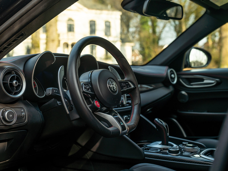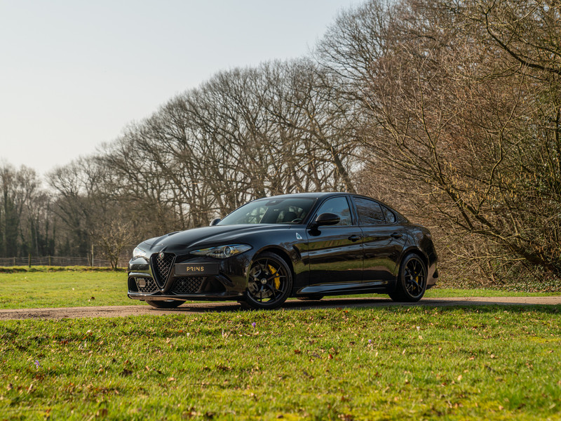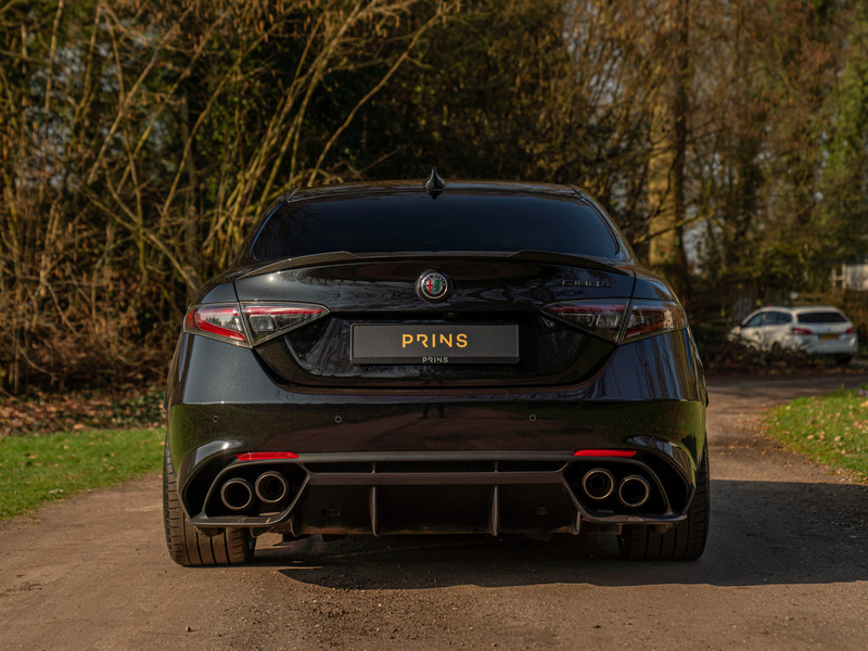 Explosief. Heet als vuur. Compleet zwartgeblakerd en dan noemen ze de lak ook nog “Nero Vulcano”. Dat kan geen toeval zijn… Deze gruwelijk mooie Alfa Romeo Giulia Quadrifoglio van modeljaar 2021 slaat genadeloos hard toe als het gaat om pure pracht, power en prestaties. Wat dat betreft hadden ze de Giulia Q ook wel “Triplo P” kunnen noemen. Maar ja, dan was de verwijzing naar het iconische klavertje vier niet compleet geweest. Driedelig is tevens de zwarte uitdossing van de 510 pk sterke bi-turbo V6 – daarover verderop meer. Een Carbon in- en exterieur, Driver Assistance Pack 2, Apple CarPlay, camera en Akrapovič sportuitlaatsysteem maken van dit brute snelheidswonder een ongekend spektakelstuk op wielen. Wie durft?