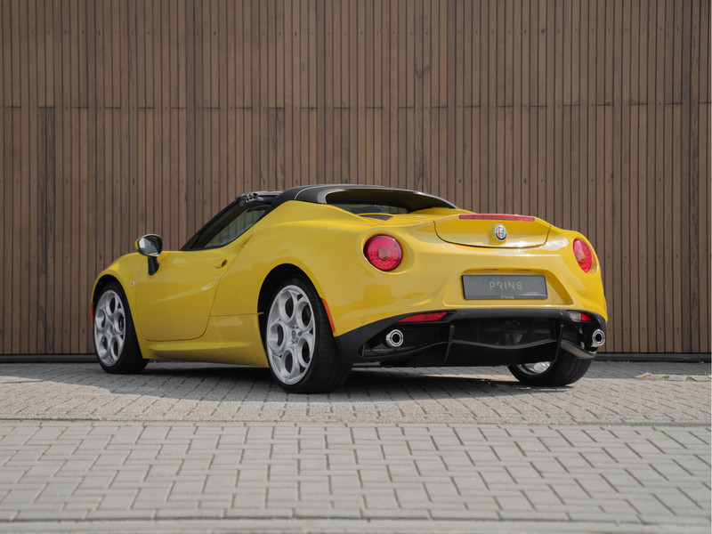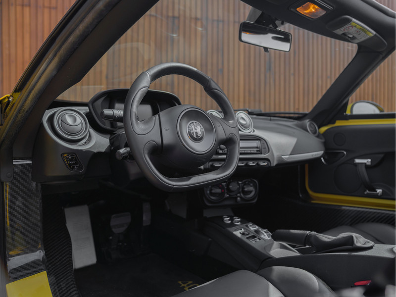 Deze schitterende Alfa Romeo 4C Spider is om meerdere redenen een hele slimme investering: met zijn beeldschone lijnenspel, no-nonsense techniek en pure rijkarakteristieken behoort de Alfa 4C tot een uitstervend ras. Een klassieker in wording! Echter, met dit specifieke exemplaar is er iets extra bijzonders aan de hand: in 2017 is hij nieuw geleverd aan de 1e en enige eigenaar – tot nu toe. Deze liefhebber bedacht niet alleen een unieke specificatie voor zijn Spider, hij behandelde zijn auto er ook naar: in de afgelopen 8 jaar reed hij er trouw enkel in ideale omstandigheden mee. Omgerekend komt dat neer op z’n 750 kilometers per jaar. Dit kan overkomen alsof hij zichzelf daarmee zwaar tekort heeft gedaan, maar het tegendeel is waar: belangrijk om te weten is dat van elke kilometer intenser dan intens is genoten! Wat wil je ook met 240 pk aan 1750 TBi-power op de achterwielen op een leeggewicht van 974 kg? Zijn acceleratietijd van 0 naar 100 km/h in 4,5 seconden is indrukwekkend, zijn stuurgedrag en wegligging zijn zowaar nog indrukwekkender. Met slechts 6.025 kilometers is dit Giallo Prototipo meesterwerk op wielen perfect bewaard gebleven. De carbon koplampen, raamlijsten en monocoque (!) leggen ondertussen de vederlichte ziel van de 4C Spider bloot. Verder is de knalgele carrosserie niet van nieuw te onderscheiden, en ook het Nero lederen binnenwerk lijkt amper te zijn aangeroerd. Giallo contraststiksels en dito logo’s corresponderen prachtig met het exterieur. We zeggen het niet gauw, maar wie zichzelf kan bedwingen en deze Alfa de komende jaren als museumstuk gaat behandelen, heeft goud in handen. Echter, zie zo’n rijdersauto pur sang maar eens weg te zetten…