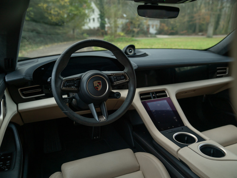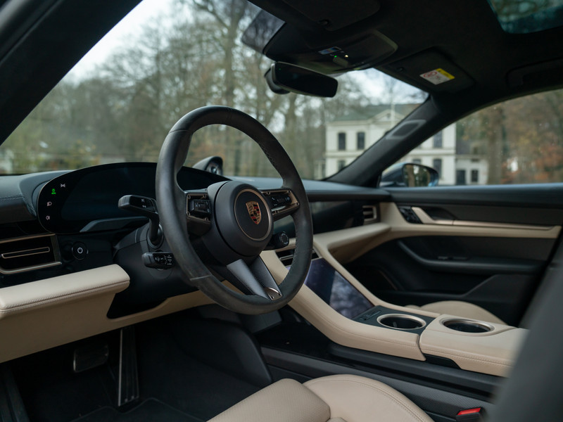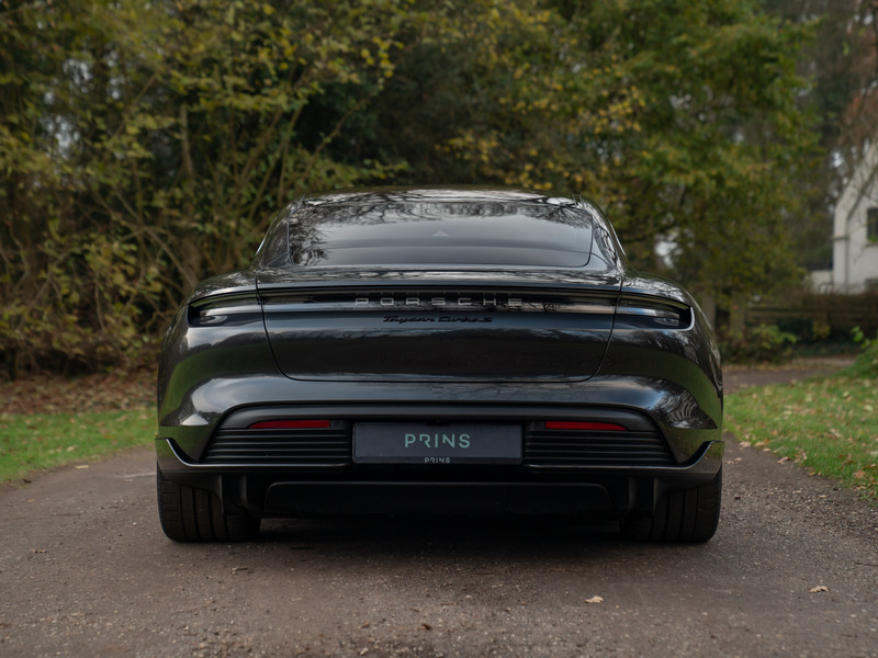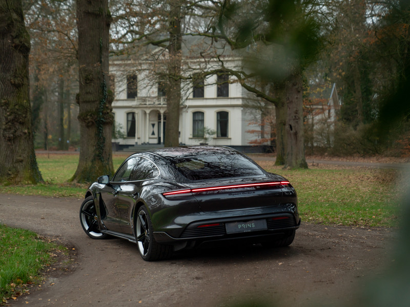 Het lijkt Porsche’s missie te zijn geworden om elektrisch rijden spannend te maken. Deze heerlijke Taycan Turbo S op 21 inch grote Mission E Design velgen is daarvan het rijdende bewijs. Met 761 pk en 1.050 Nm koppel (!) aan boord maakt de EV alvast een verpletterende indruk als het om prestaties gaat: 0 naar 100 km/h in 2,8 seconden… Welke hypercar met benzinemotor doet ‘m dat na? Zo ingetogen als het Vulkaangrijs metallic lakwerk aandoet, zo explosief is de snelheidsopbouw. En dan te weten dat de Porsche Taycan nog tamelijk functioneel is ook: met 4 portieren en 5 zitplaatsen hoeft u niet te kiezen welk gezinslid er meegaat om een F1-achtige acceleratie te ervaren. Het motorgeluid schittert door afwezigheid, maar het Burmester 3D High-End Surround Sound systeem weet dit op oorstrelende manier te compenseren. Andere hoogwaardige extra’s treft u in de vorm van een panoramadak, achterasbesturing, luchtvering, Surround View Camera, stoelverwarming, stuurverwarming, Matrix LED-koplampen en een Licht Design pakket. Het Basalt Clubleder op stoelen, midden-/tunnelconsole, portieren en onderzijde dashboard is origineel en smaakvol tegelijkertijd. Het spannendste zijn echter de opties die het adrenalineniveau door het dak laten gaan: zowel het SportDesign exterieurpakket als het GT Sportstuur bevat carbon elementen. Kortom, helemaal hightech en puur op performance gericht. Net als Porsche Dynamic Chassis Control Sport (PDCC Sport) en Porsche Ceramic Composite Brake (PCCB) om al dit technische geweld weer veilig en stabiel tot stilstand te kunnen brengen. Nee, dit is geen Porsche zoals we Porsche kennen. Aan de andere kant: hij doet zijn naam Turbo S zonder twijfel eer aan.