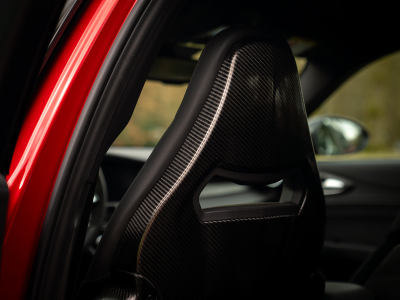 De echte kenner zal het laatste modeljaar van de Giulia Q met zijn of haar ogen dicht herkennen. Toch kunnen we het niet laten om kort de highlights te doorlopen. Met de nadruk op ‘lights’, want de herziende indeling van de koplampunits behoren toch wel tot de meest karakteristieke veranderingen. De 3 afzonderlijke LED-elementen per unit doen oude Alfa-tijden herleven, met de iconische 159 nog vers in ons geheugen. De donkere achtergrond van diezelfde koplampen zijn op hun beurt helemaal in lijn met de “smoked” achterlichten vanachter helder glas, alsmede de antracietkleurige Q-velgen, zwarte Scudetto grille, dito spiegelkappen en vele carbon exterieurdetails. Onder andere de frontlip, side skirts, kofferklepspoiler, en natuurlijk de afwerking rondom de Akrapovic uitlaateindstukken. Het contrast met de dieprode Rosso Etna lak is beeldschoon en weet iedereen te boeien. Wel óf geen autofanaat. Al denken we zeker te weten tot welke categorie de lezer behoort…