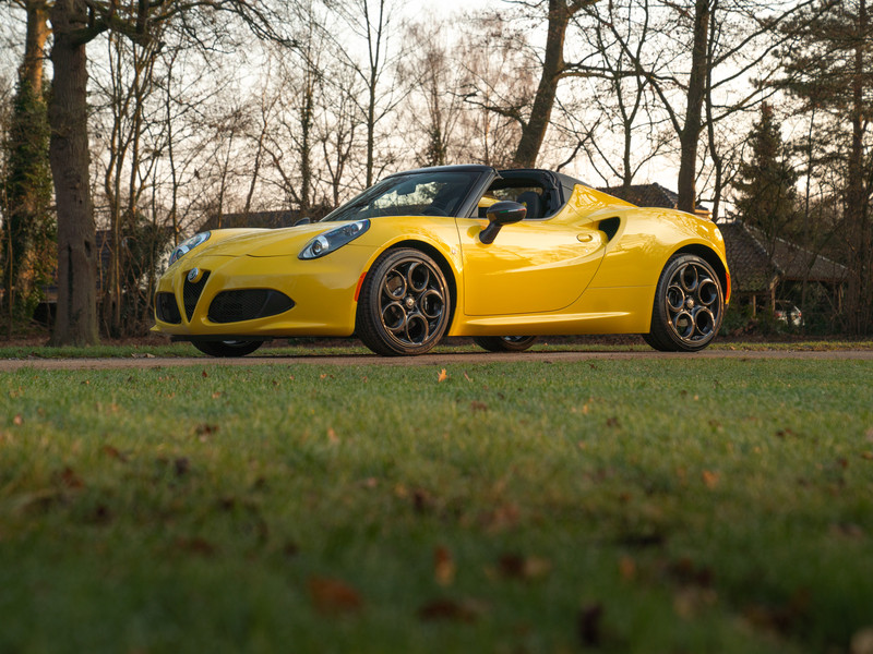 Deze schitterende Alfa Romeo 4C Spider is om meerdere redenen een hele slimme investering: met zijn beeldschone lijnenspel, no-nonsense techniek en pure rijkarakteristieken behoort de Alfa 4C tot een uitstervend ras. Een klassieker in wording! Echter, met dit specifieke exemplaar is er iets extra bijzonders aan de hand: in 2017 is hij nieuw geleverd aan de 1e en enige eigenaar – tot nu toe. Deze liefhebber bedacht niet alleen een unieke specificatie voor zijn Spider, hij behandelde zijn auto er ook naar: in de afgelopen 8 jaar reed hij er trouw enkel in ideale omstandigheden mee. Omgerekend komt dat neer op z’n 750 kilometers per jaar. Dit kan overkomen alsof hij zichzelf daarmee zwaar tekort heeft gedaan, maar het tegendeel is waar: belangrijk om te weten is dat van elke kilometer intenser dan intens is genoten! Wat wil je ook met 240 pk aan 1750 TBi-power op de achterwielen op een leeggewicht van 974 kg? Zijn acceleratietijd van 0 naar 100 km/h in 4,5 seconden is indrukwekkend, zijn stuurgedrag en wegligging zijn zowaar nog indrukwekkender. Met slechts 6.025 kilometers is dit Giallo Prototipo meesterwerk op wielen perfect bewaard gebleven. De carbon koplampen, raamlijsten, spiegelkappen en monocoque (!) leggen ondertussen de vederlichte ziel van de 4C Spider bloot. Verder is de knalgele carrosserie niet van nieuw te onderscheiden, en ook het Nero lederen binnenwerk lijkt amper te zijn aangeroerd. Giallo contraststiksels en dito logo’s corresponderen prachtig met het exterieur. We zeggen het niet gauw, maar wie zichzelf kan bedwingen en deze Alfa de komende jaren als museumstuk gaat behandelen, heeft goud in handen. Echter, zie zo’n rijdersauto pur sang maar eens weg te zetten…