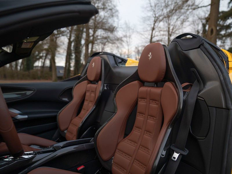 En wat is een zomers gekleurde hypercar zonder de zon te aanbidden? Wanneer het Nero DS dak wordt verwijderd, krijgen toeschouwers vrij zicht op de prachtige cockpit van de SF90 Spider. De Large uitgevoerde Carbon Racing Seats zijn in hoogte verstelbaar, bevatten legendarische Daytona patches en zijn afgewerkt met super smaakvol Terra Bruciata lederen bekleding. Hetzelfde donkerbruine leder komt terug op het stuurwiel en de portiergrepen. De onderzijde van het dashboard heeft op zijn beurt een Terra Bruciata alcantara finish, terwijl de Nero lederen bovenzijde + dito portieren voor een aangenaam contrast zorgen aan boord van de Ferrari. Grigio Chiaro Cavallino’s in de hoofdsteunen garanderen een stijlvolle landing van uw achterhoofd tijdens accelereren. Hoe minder gewicht, hoe korter de sprint: de Carbon Driver Zone (+ LED Shift Indicator), Carbon Centre Console en Carbon Dashboard Inserts hebben niet alleen een positieve invloed op de racy looks, maar ook op de prestaties. Klaar om de zilveren Dedication Plate aan uzelf op te dragen?