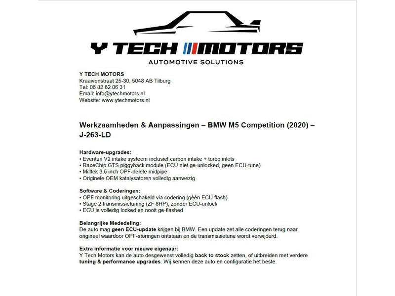 Bijzonder unieke M5 Competition: Origineel Nederlandse auto, Facelift model met de nieuwe neus, stuurwiel, achterlichten etc. model 2020-2023, (de meeste 2020 bouwjaar M5 online aangeboden auto's zijn oud model), Unieke auto, echte liefhebbersuitvoering, Brands Hatch Grey metallic met extreem veel opties, RDW nieuwprijs exclusief alle upgrades 201.894 euro, 4.4 V8 Bi-Turbo Performance upgrade tot 740 PK getest vermogen door professionele hardware: Eventure carbon luchtfilters, OPF delete, Decat / geen katalysatoren, GTS 5 Black Race chip, Sportuitlaat met 2x M1 toets indrukken gaat alles open, M Carbon Keramische remmen, Carbon motorplaat, Carbon diffuser, Carbon achterspoiler, Carbon dak, Bowers & Wilkins High End Audio, Entertainment professional met 2 schermen achterin origineel vanaf fabriek, Shadow Line Hoogglans zwarte exterieurstyling raamlijsten, nieren en uitlaat, Adaptive cruise control met actieve stuurassistentie, Laser LED koplampen, Stoelventilatie, Massagestoelen met verschillende programma's, Surround view 360 graden camerasysteem, 20 inch lichtmetalen velgen breedset, Soft close sluitbekrachtiging portieren, Stuurwielverwarming, Elektrische achterklep, Privacy glass, Merino Scharz leder sportinterieur met verlichte M5 logo's, Verlichte M5 dorpellijsten, M5 projectie op de straat, Draadloze Apple Carplay / Android Auto, DAB+ Digitale radio, BMW Display Key, Klasse 3 en 4 alarmsysteem met certificaat, M Seatbelts, M gordels, Keramische interieurdetails, 4 zone climate control, Garagedeur opener HomeLink, 50 Jahre jubileumlogo's.