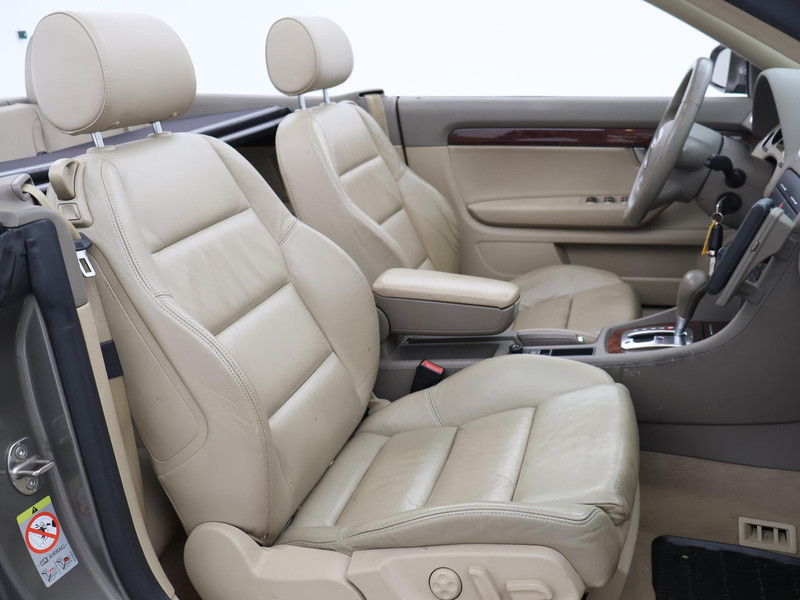 A4 cabrio 3.0 TDI V6 232 PK Quattro in het Alpaca Beige metallic (kleur Y5) met Beige leder sportinterieur met verlengbaar zitvlak en stoelverwarming. Navigatie, Climate control, Cruise control, Xenon verlichting, Parkeersensoren voor + achter, Windscherm, Elektrische stoelverstelling, Houtinleg dashboard, Bluetooth carkit. Youngtimer met dagwaarde bijtelling bij zakelijke aanschaf.